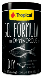 - Krmivo ve formě DIY gelu s řasami, krilem a ovocem pro všežravé ryby